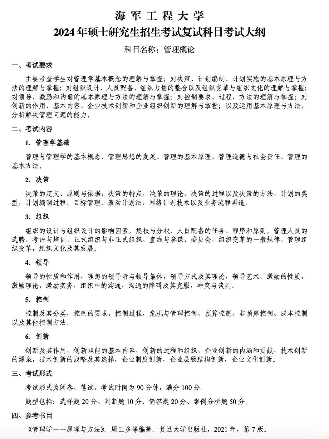 海军工程大学2024工程管理硕士复试大纲