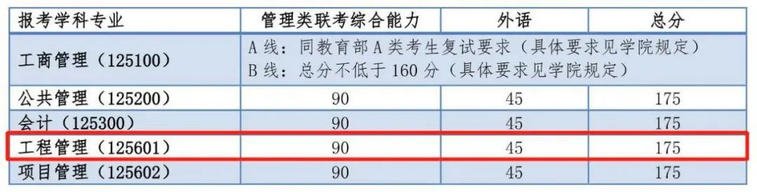 清华大学MEM:A类复试线:总分不低于175分,且单科英语不低于44分、管理类综合不低于88分;B类复试线:总分不低于175分,且单科英语不低于45分、管理类综合不低于90分。